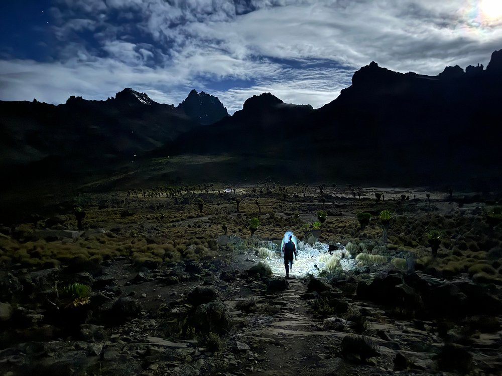 The day starts early at 3 AM to catch the stunning sunrise on the peak of Point Lenana. The trek takes us through a steep path that cuts through a cliff and takes about 3 hours. As the darkness clears, point Lenana becomes visible. After summiting Mount Kenya, we rest at the peak, take in the views, and have a photographing session.